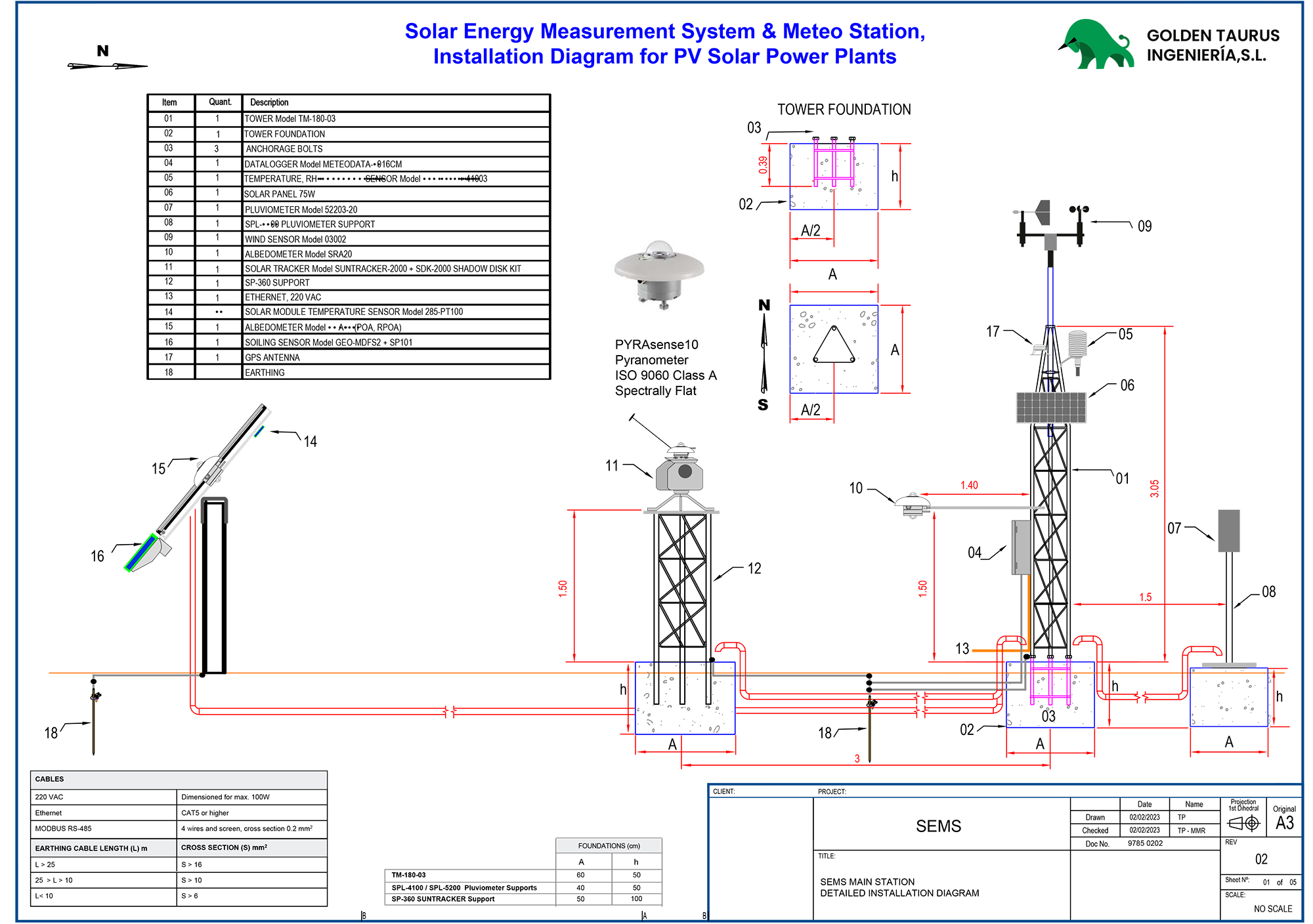Estación Meteorológica Automática en planta solar fotovoltaica. Incluye mástil, Datalogger y sensores para la medición de Irradiancia Horizontal Global (GHI), Temperatura, Viento, HR, etc.
