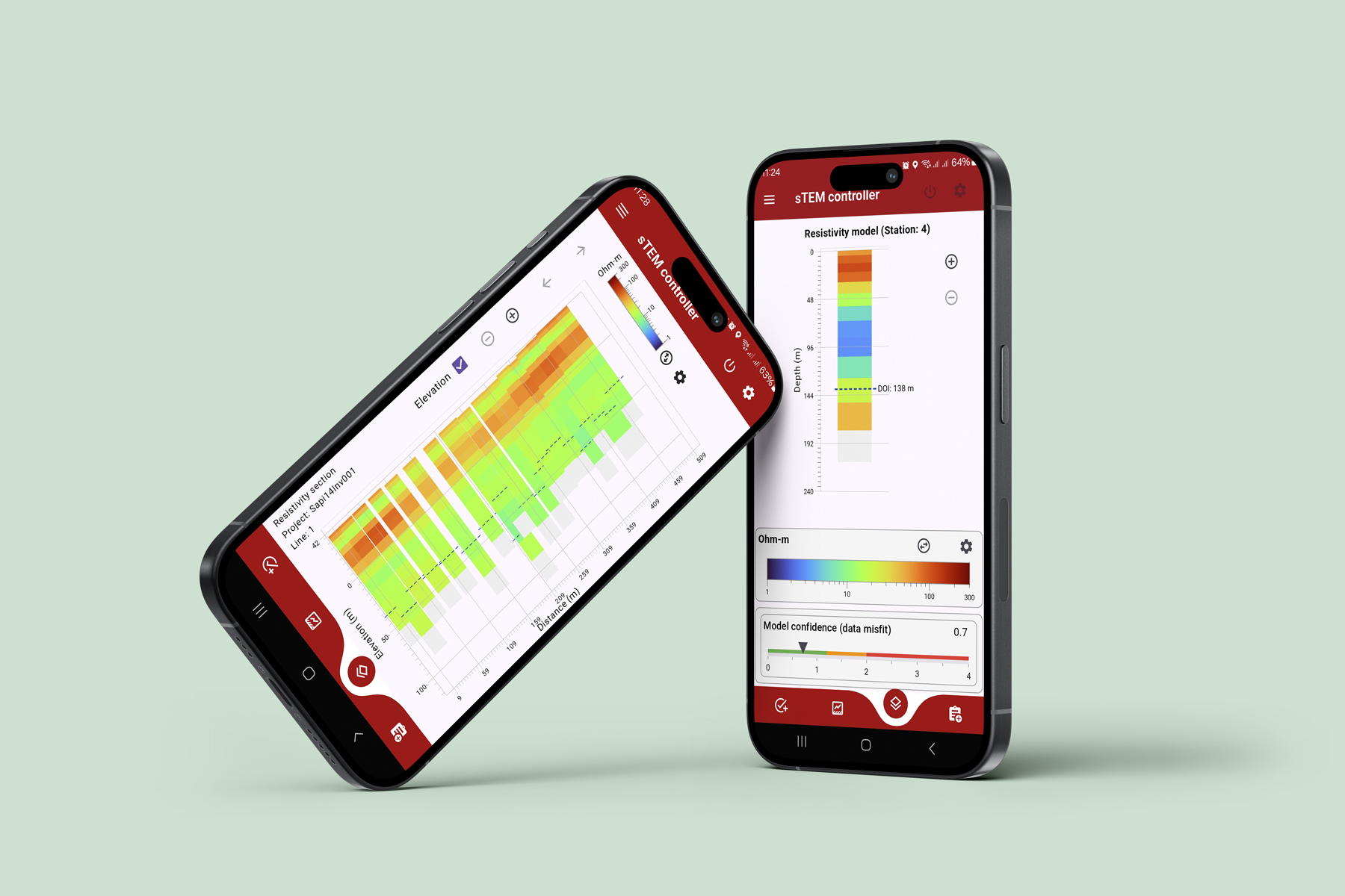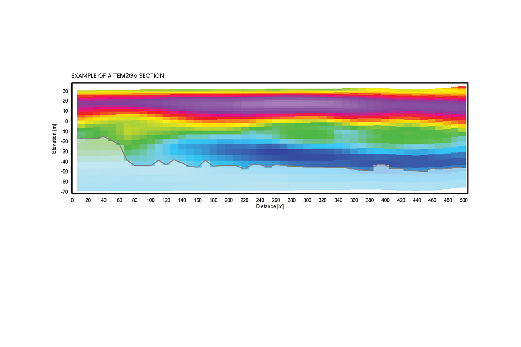El transmisor y el receptor del TEM2Go, conectados de forma inalámbrica, se manejan a través de una aplicación para Android o iOS y están separados por una distancia de entre 15 y 20 metros. Los datos se miden continuamente mientras se camina, capturando la estructura de conductividad del subsuelo desde la superficie superior hasta profundidades de 75 m en función de la resistividad de las capas geológicas. El TEM2Go dispone de datos procesados en tiempo real, modelos invertidos y visualización de mapas.